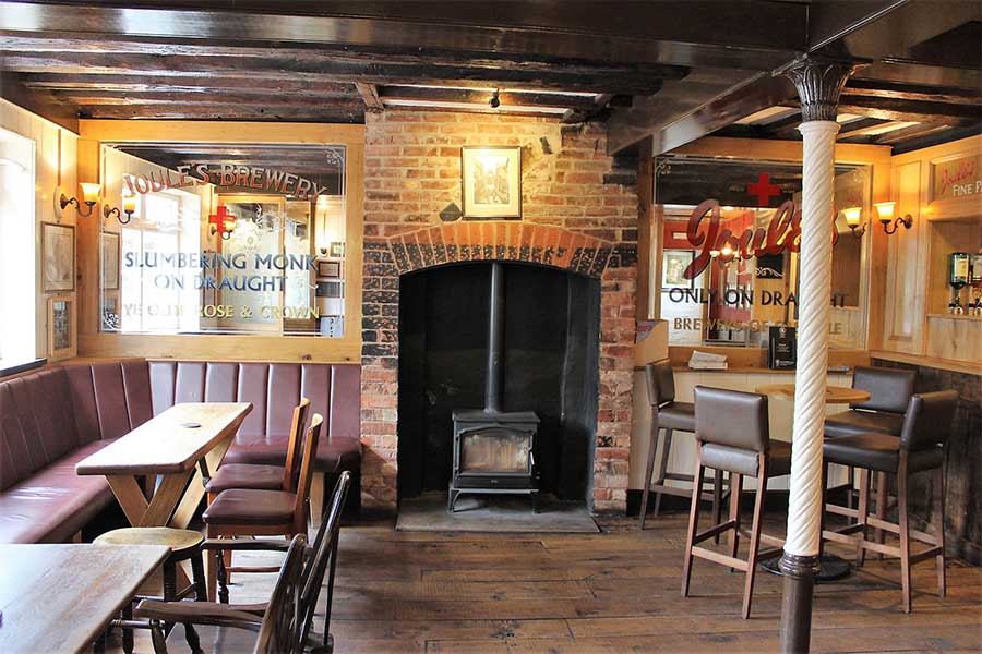 Ye Olde Rose and Crown was built around 1830, but the extensive cellar with an arched ceiling are substantially older, forming part of the original ale house. We restored this cosy, characterful quintessential ‘hole in the wall pub’ in 2011. Revealing original panelling which lay hidden for years, wide oak board flooring and a commission for the biggest Joule’s etched mirror, depicting an original design for Joule’s Slumbering Monk.